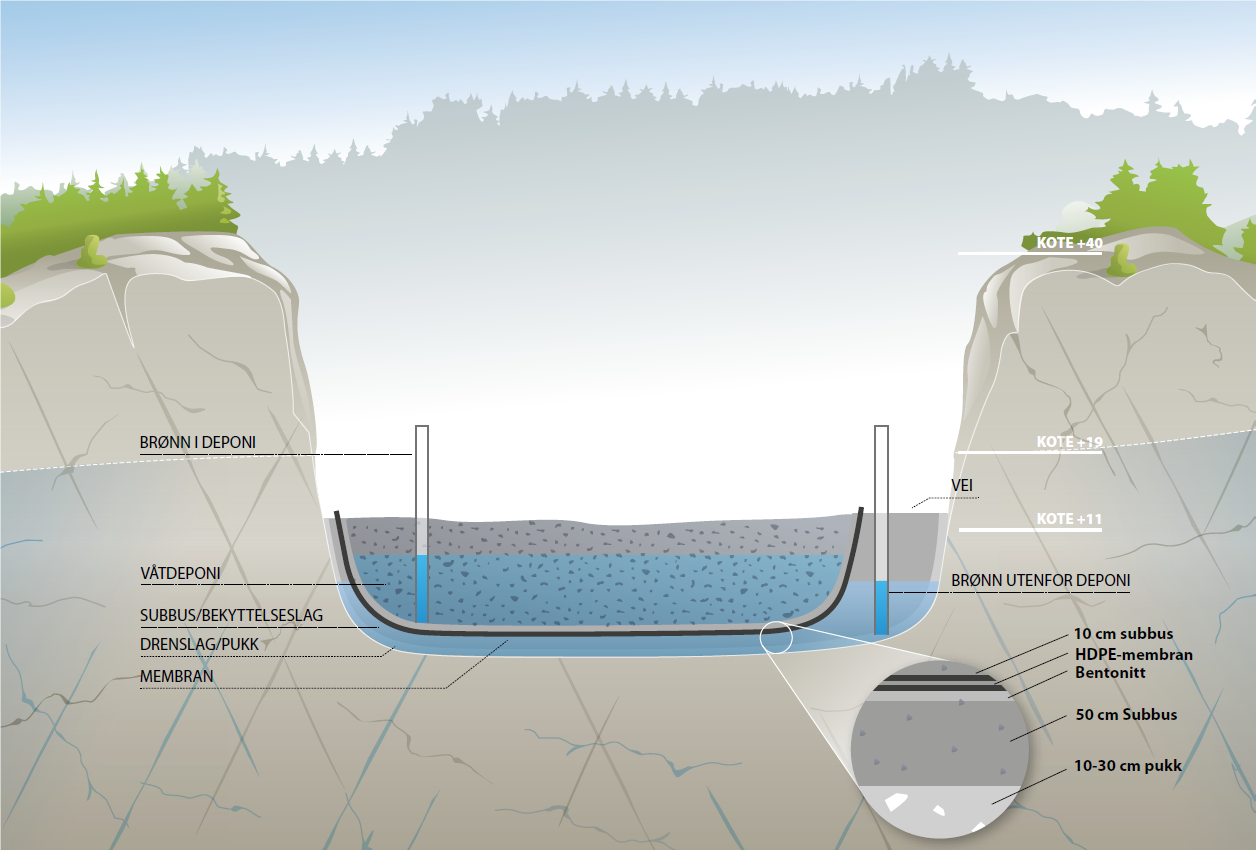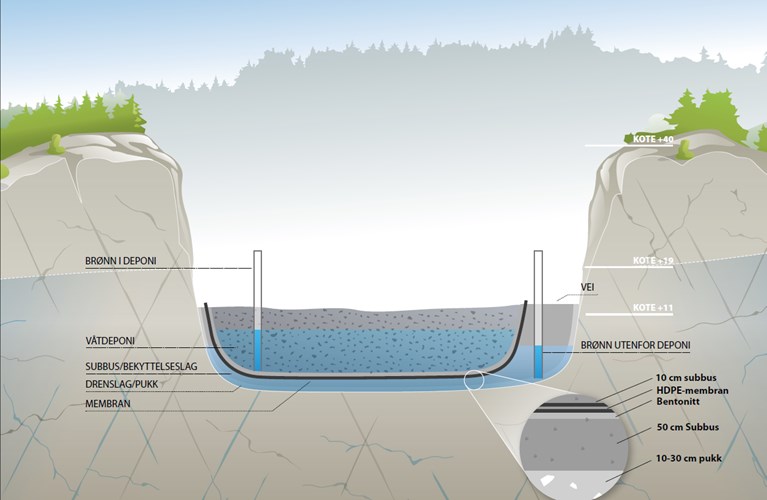Figuren over er en prinsipiell skisse som viser deponiets oppbygning og oppfylling i steinbruddet.